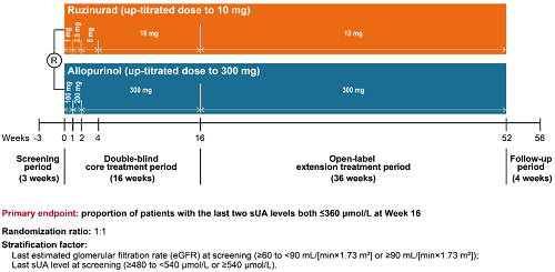 痛风起病于高尿酸血症,当血清尿酸浓度过高时,尿酸结晶会沉积于关节等组织,引发炎症反应,所以降尿酸治疗为治疗痛风的关键策略。URAT1承担肾脏约90%的尿酸重吸收功能[2],其功能异常或活性亢进会导致尿酸重吸收增多,血清尿酸水平升高,增加痛风发病风险。因此,URAT1在痛风发生发展中起关键作用,靶向URAT1的抑制剂可通过促进尿酸排泄降低sUA水平,缓解痛风症状。鲁兹诺雷钠片是尊龙时凯医药自主研发的一种高选择性URAT1抑制剂,在前期的一期、二期研究中,鲁兹诺雷钠片耐受性良好,并显示出显著降低高尿酸血症患者sUA的效果[3]。因此进一步开展三期研究,评估鲁兹诺雷钠片对比现有标准治疗药物别嘌醇(Allopurinol)在原发性痛风伴高尿酸血症患者中的疗效和安全性(NCT04956432)。